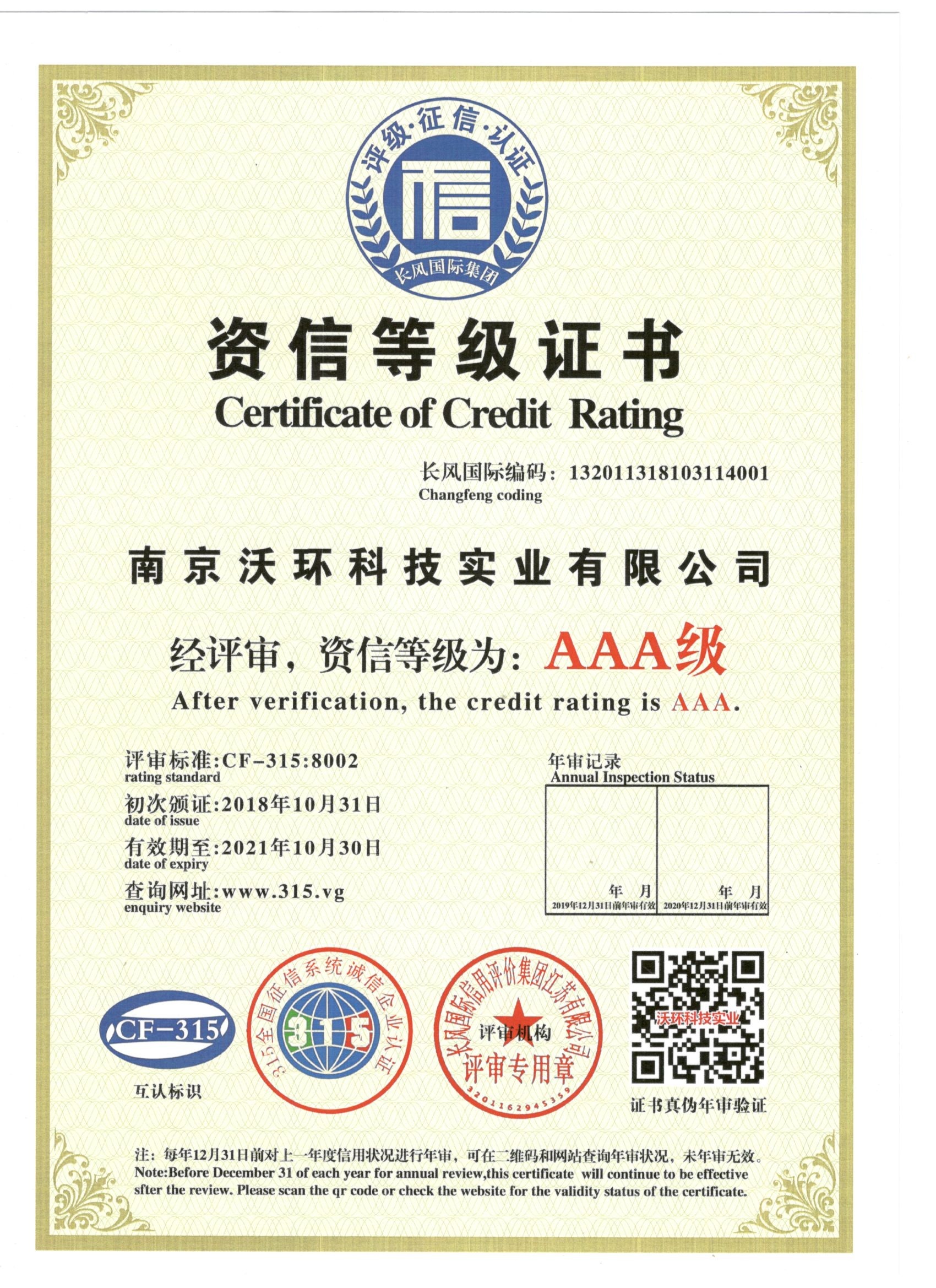 熱烈祝賀南京沃環(huán)公司被專業(yè)評(píng)審機(jī)構(gòu)-長(zhǎng)風(fēng)國(guó)際集團(tuán)評(píng)為AAA級(jí)資信等級(jí)